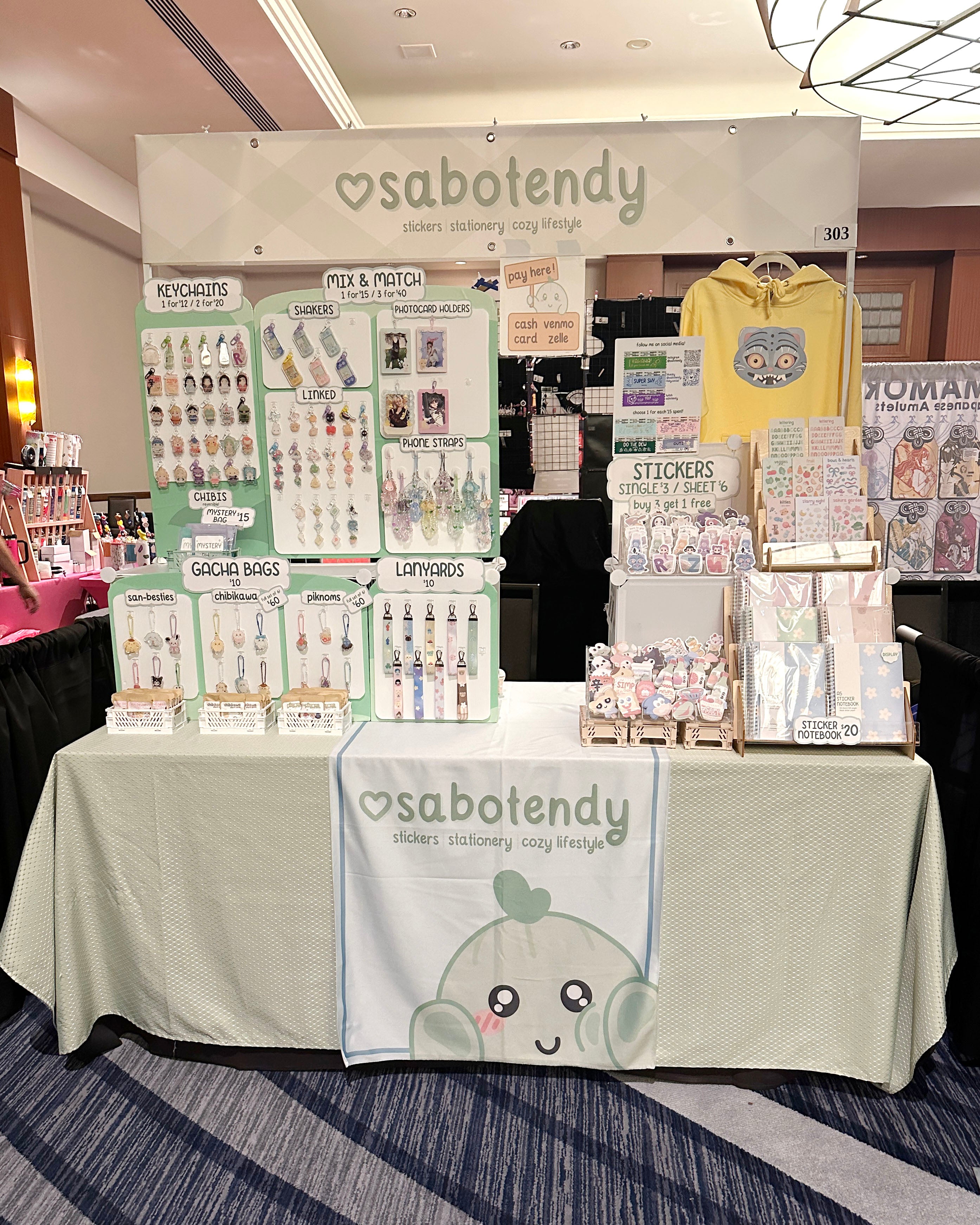 sabotendy products include stickers, stationery, art prints, and lifestyle such as keychains, pins, deskmats, & apparel.